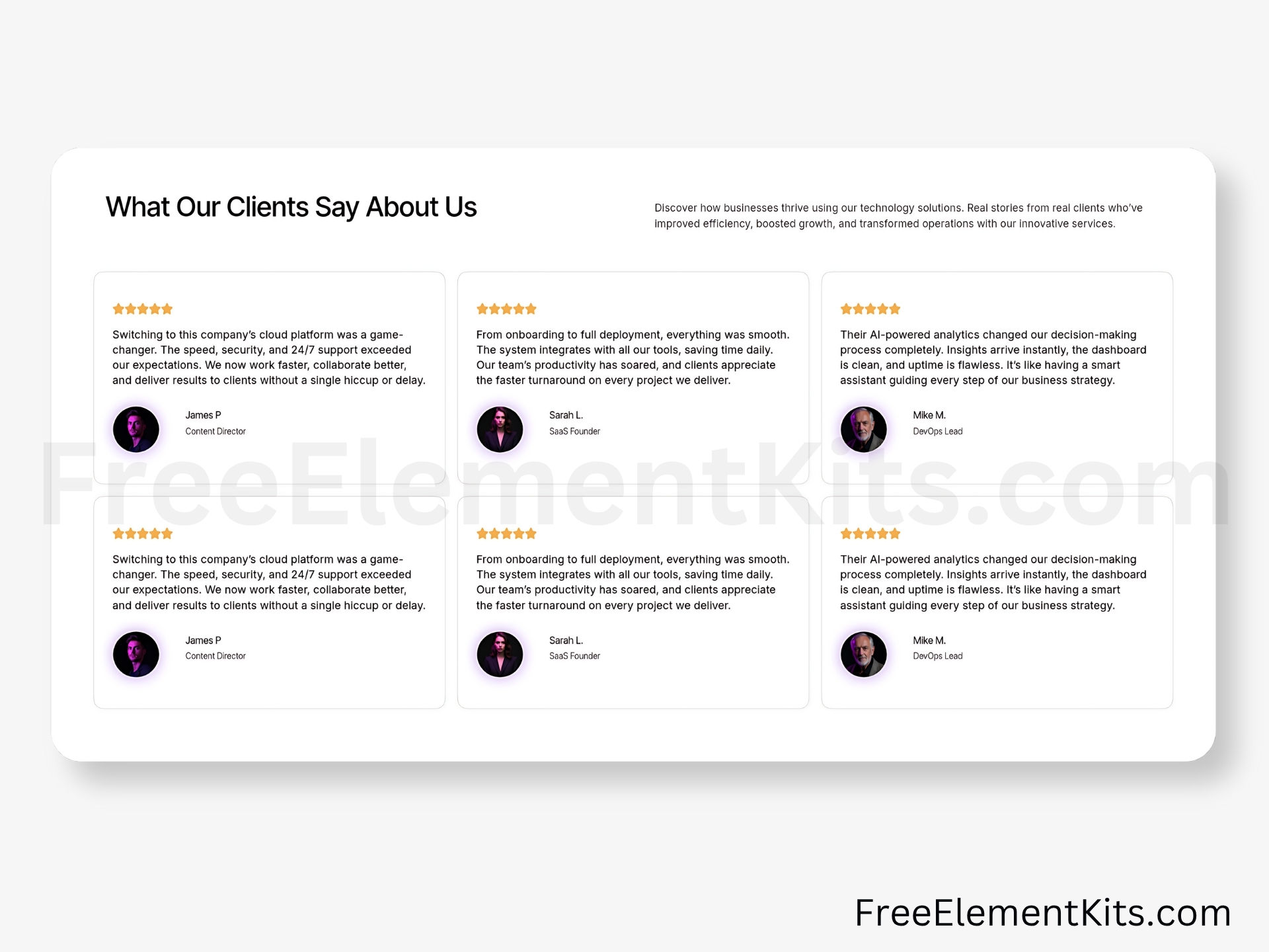 This minimalist Elementor testimonial section is crafted for clarity and elegance. Perfect for WordPress websites that value clean design, it highlights client feedback in a professional and visually appealing way. Fully responsive and easy to customize, it integrates seamlessly with your existing site style.